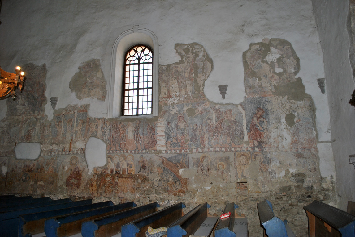 A hajó északi falának teljes hosszát, nyugatról kelet felé haladva, három falképsor tölti ki: a felső sávban- késő gótikus gyámkövekkel és boltfiókokkal megrongált Szent László legenda, alatta Antiochiai Szent Margit legendájának jelenetei, legalul az Utolsó ítélet és néhány ehhez tartotó ábrázolás.