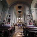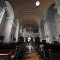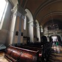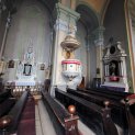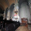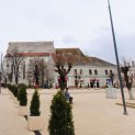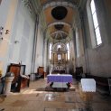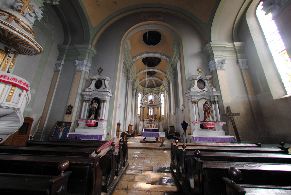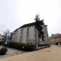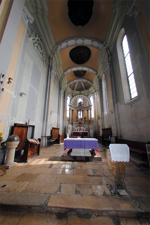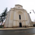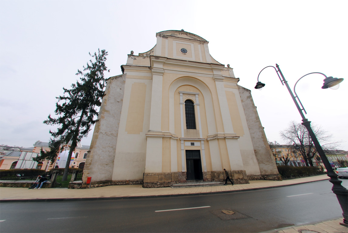 A főtér északi részén épült, eredeti stílusa alapján építési korát a 15. századra teszik. Ennek kőbe vésett bizonyítékai is vannak: egy külső támpilléren 1458-as, egy másikon 1478-as, egy harmadikon 1504-es dátum található. Eredetileg csarnoktemplom volt: mellékhajói a középhajóval egy magasságban épültek, régi gótikus jegyeiből csak a külseje őrzött meg valamit, belsejét teljesen átalakították, ugyanis 1822-ben tűzvész pusztította. Tornya nem volt, de egy útrendezéskor két torony alapjaira bukkantak. A templomot egykor várfal vette körül, mely római vár romköveinek felhasználásával épült 1455-ben.